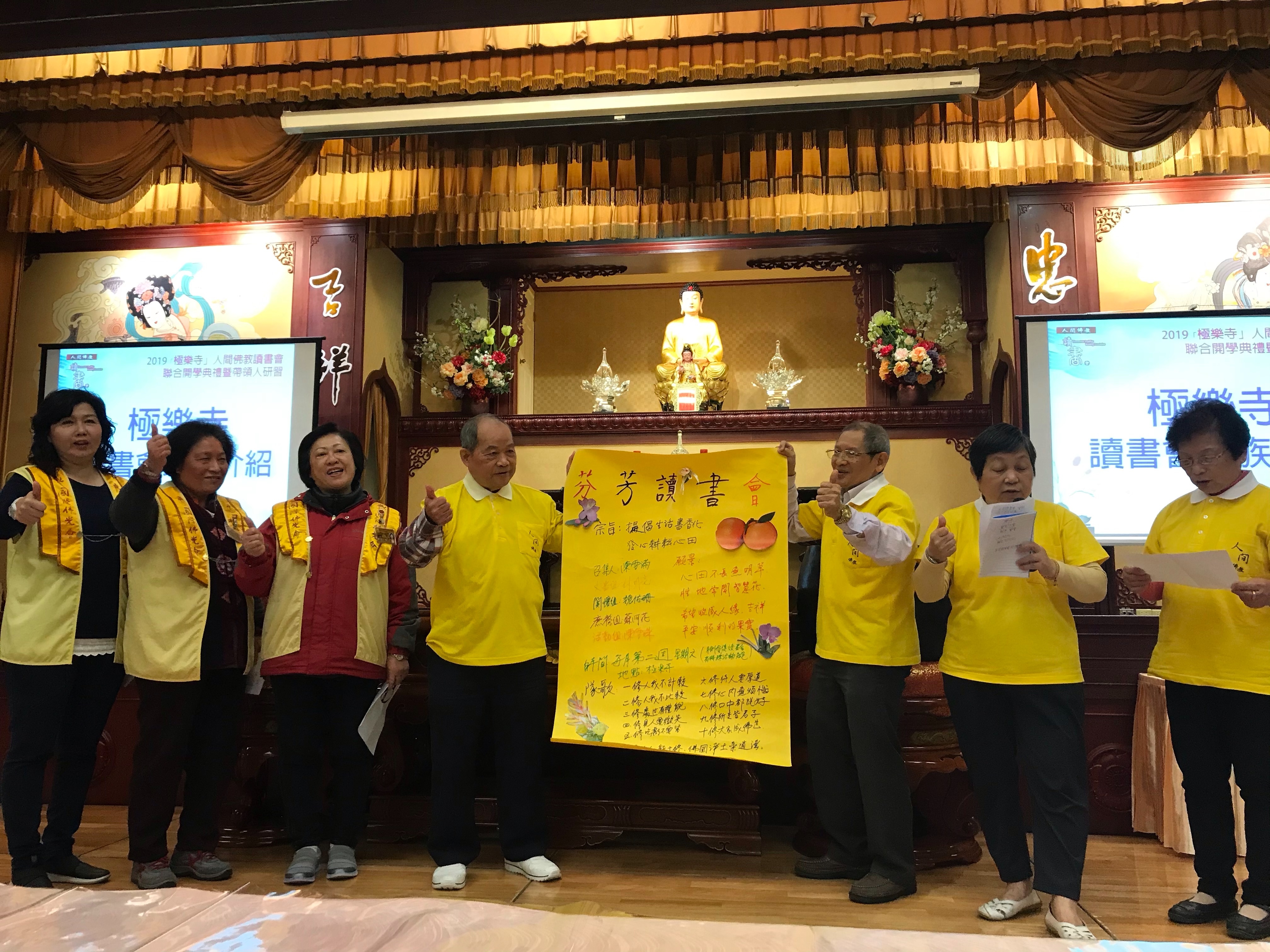 107.12.29在極樂寺 召集人陳雪滿及芬芳讀書會學員做海報、唱會歌。