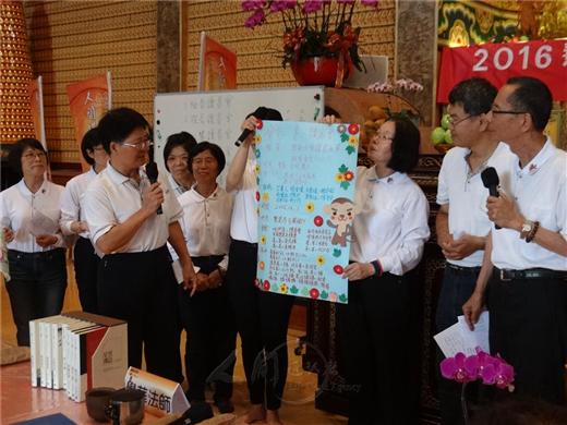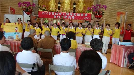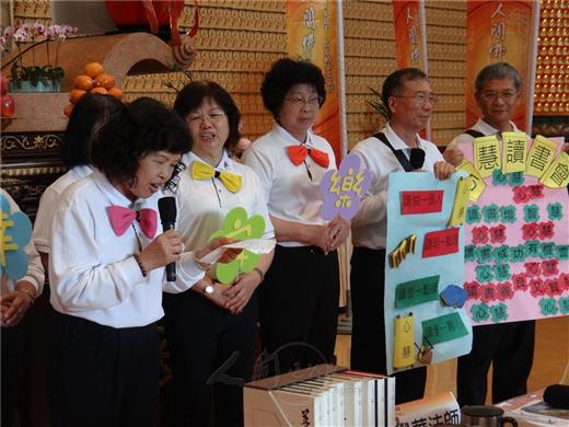 [caption id="attachment_1862" align="alignnone" width="520"] 慧慈幼兒園主任游素珍4月23日帶領13名老師,參加人間佛教讀書會慧慈寺各讀書會開學典禮,並宣布:「慧園讀書會就在此時此刻、良辰吉日宣布成立!」[/caption] [caption id="attachment_1861" align="alignnone" width="520"] 人間佛教讀書會慧慈寺各讀書會4月23日開學典禮,善二讀書會分享讀書心得。[/caption] [caption id="attachment_1860" align="alignnone" width="520"] 人間佛教讀書會慧慈寺各讀書會4月23日開學典禮,心慧讀書會分享讀書心得。[/caption] [caption id="attachment_1859" align="alignnone" width="520"] 人間佛教讀書會慧慈寺各讀書會4月23日開學典禮,心識、般若、心話等讀書會的有效成員約80人參加,各讀書會精心設計創意進場並分享讀書心得。[/caption] 2016-04-23 ‧ 活動報導 「慧園讀書會就在此時此刻、良辰吉日宣布成立!」台南善化慧慈幼兒園主任游素珍,4月23日帶領13名老師參加人間佛教讀書會慧慈寺各讀書會開學典禮,另有心識、般若、心話等讀書會的有效成員約80人,一起參加各讀書會精心設計的創意進場並分享讀書心得。 慧慈寺住持覺華法師致詞,引用星雲大師的「讀書四法」-眼明則巧於攝受,手快則易於剪裁,心細則精於分明,膽大則決於去勉勵會員們;也分享如何抄寫或剪貼好文章,並分類應用。他摘錄《華嚴經》等經典中的好句子,作為祝禱回向的內容。覺華法師說,連禪詩「春有百花冬有雪,夏有涼風秋有月,若無閒事掛心頭,便是人間好時節。」也可朗誦或吟唱。 人間讀書會總部妙寧法師介紹讀書會的類型,有經典、山水、香積、兒童、青年等多樣,慧慈寺的房務與環保義工在工作後也可共讀。妙寧法師鼓勵大家從家庭開始,三個人就可以成立讀書會。每週或雙週一次,訂定主題來看書或影片,大家一起談,討論的內容可以是人或景物。讀書會的目的是:讀做一個人、讀明一點理、讀悟一些緣、讀懂一顆心。 「舉起你的右手,麻豆麻豆。舉起你的左手,柚香柚香。…」別著紅色花布領巾,柚香讀書會的成員精神飽滿地喊著隊呼進入開學典禮會場。因為成員住在麻豆,讀書會就取名「柚香」,讓人聯想到他們聞著柚子花香、捧著書一起讀誦的情景。他們也曾相邀參加佛學會考,其中詹金英還與女兒、孫子三代一起共讀赴考。 慧慈幼兒園主任游素珍認為「讀書四法」很好,將運用於剛成立的讀書會中。慧慈幼兒園8個班級都成立讀書會,由老師帶領讀《佛光菜根譚兒童故事集》。幼幼班看圖說故事,小班以上的小朋友則增加文字閱讀,也可用唱遊方式來進行讀書會。 【人間社記者 孫芳菲 善化報導】