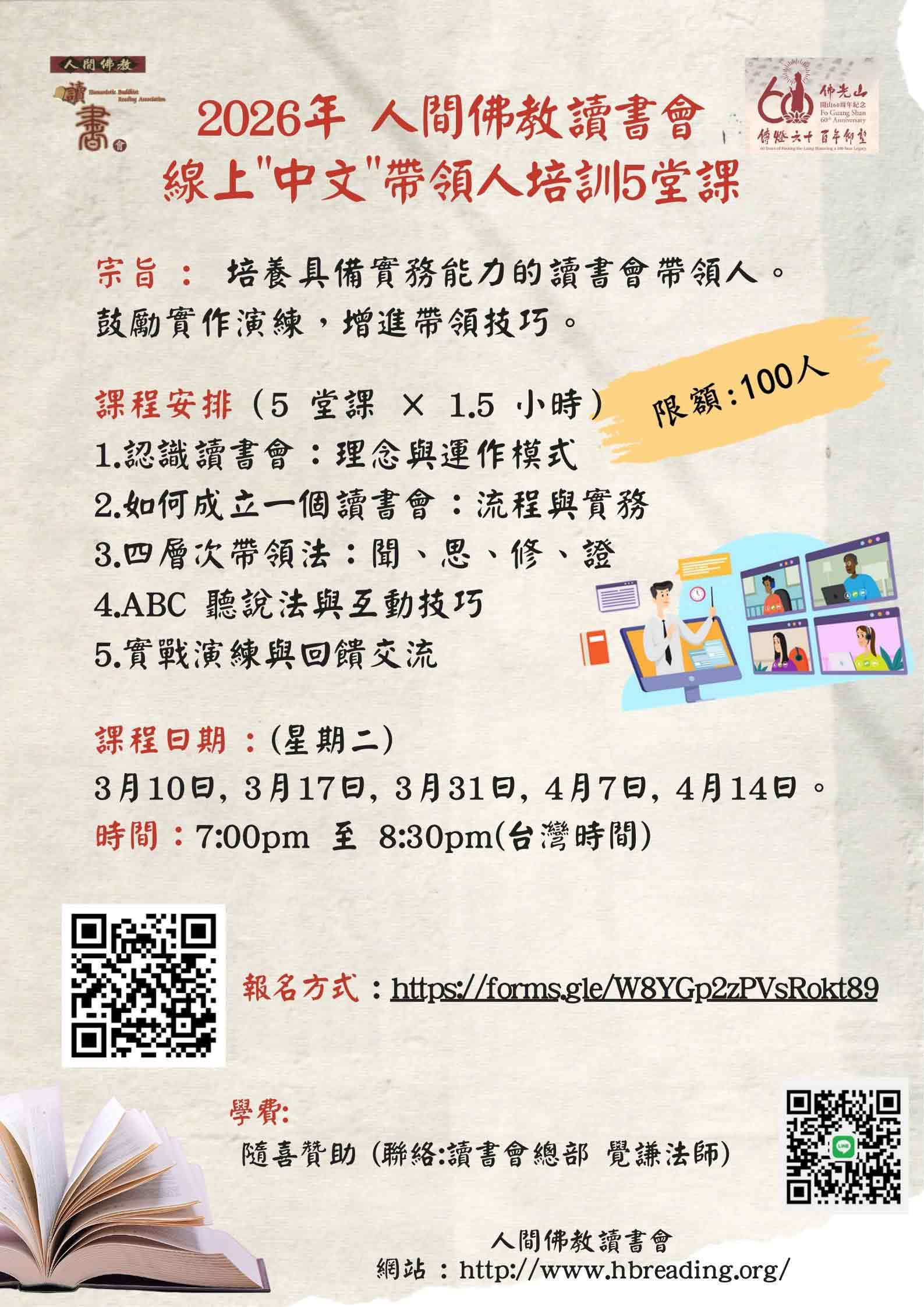 人間佛教讀書會(HBRA)推出五堂課”中文” 線上帶領人培訓工作坊,旨在系統提升學員帶領讀書會的能力,培養策劃、互動與引導討論的專業技巧。
