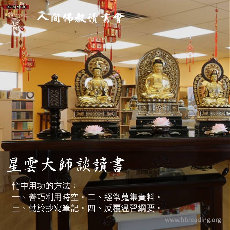 忙中用功的方法:一、善巧利用時空。二、經常蒐集資料。三、勤於抄寫筆記。四、反覆溫習綱要。